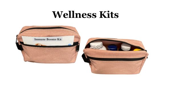 Each wellness kit comes with 4 high purity supplements, an information card on how and when to use each supplement and nutrition recipe card aimed to support the target condition. Available in pink (shown) or dark gray zippered pouch.